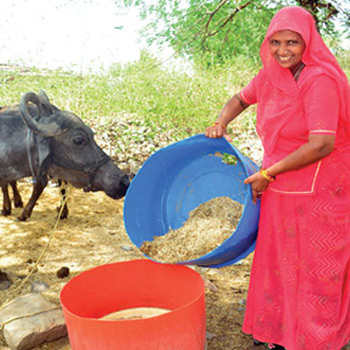 Shyam Kunwar, in Jhalawar, Rajasthan, is a widow and mother of three and a proud farmer today. Determined to change her life, Shyam Kunwar went from working as a daily wage laborer for a decade after her husband suddenly died, to joining an ITC-run Farmer Field School for women. She says, "I learned about improved agriculture practices, saved money through the higher income gained from adopting these practices, started a small grocery shop and also began to grow crops on my 1.2 acres of land. With the assistance of the SHG, I was able to invest in a flour machine and a deep freezer and purchase two buffaloes."