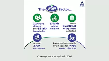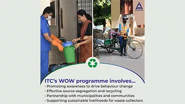 At ITC, we recognise the challenge and are privileged to contribute to the Swachh Bharat Mission through our waste management programmes. Swipe through this carousel to know how our flagship initiative ITC WOW - 'Wellbeing Out of Waste' is designed to turn our bustling cities and towns into cleaner spaces.