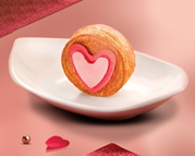 Ruby Chocolate and Cherry Cremeux Croissant Suprême: Indulge in a delightful buttery croissant, rolled to perfection, and filled with tangy cherry cremeux, all wrapped in luxurious Ruby chocolate glaze at a price of INR 236.